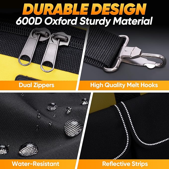TICONN Tool Bag with Multi-Pockets Wide Mouth Tool Tote with Safety Reflective Straps, Adjustable Shoulder Strap and Ergonomic Handle (Yellow, 16" Standard Base) -
