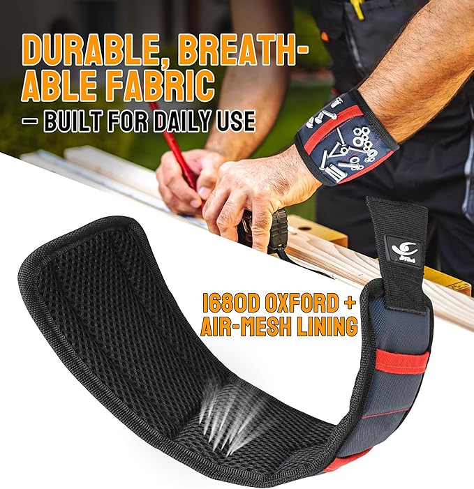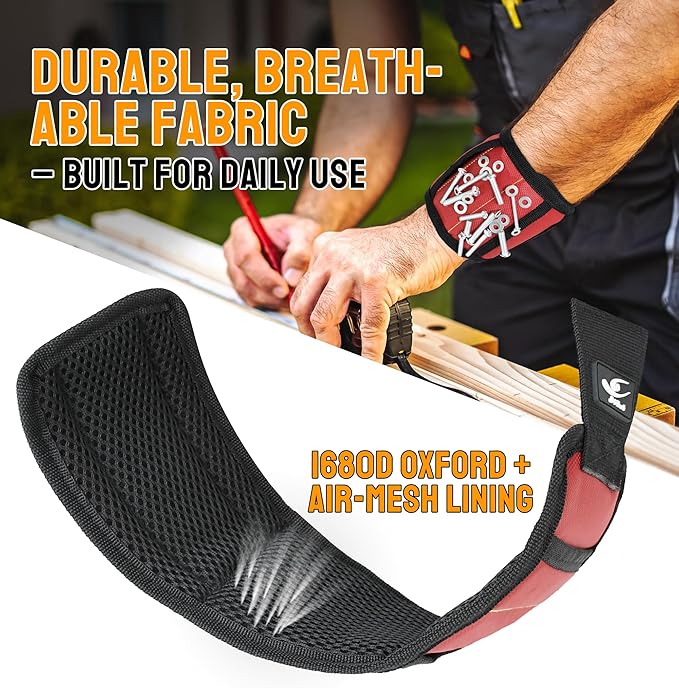HiRui Magnetic Wristband for Tools – Ultra-Strong 15 Neodymium Magnets Hold Screws, Nails & Bits, Dual Pockets – Hands‑Free for DIY, Home Repairs, Auto – Gift‑Ready for Dad, Husband, Grandpa (Red) -