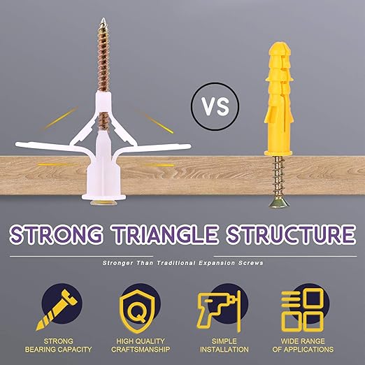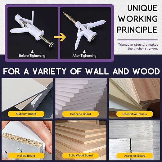 • 2,Durable Quality ------ Constructed from durable plastic to last for years. self-drilling screws kit is made of high quality Stainless Steel. Residential drywall anchor provides a firm hold from within 3/8"- to 1/2"-thick drywall.