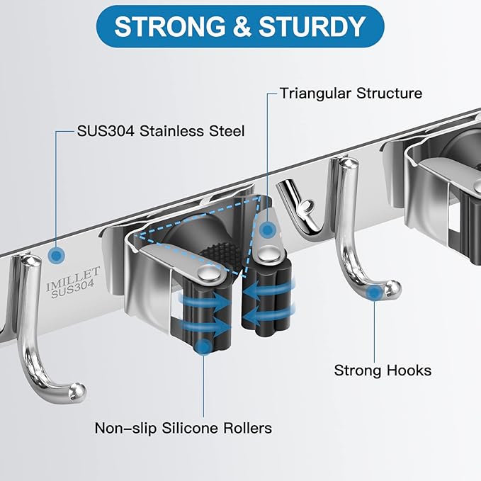 • STRONG & STURDY: Broom organizer wall mount is made of 304 stainless steel, corrosion-resistant, moisture proof and waterproof. Compared with the plastic broom rack, it's more stronger and sturdy. And this broom hanger wall mount can hold up to 200 pounds