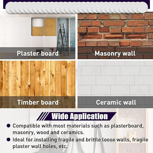 • Wide applications: Drywall anchor hole repair kit suitable for mounting or fittings on shelves, curtain rails, shelving boards, etc. Fit for most materials such as plasterboard, stone, wood and ceramics
